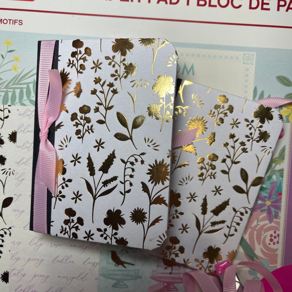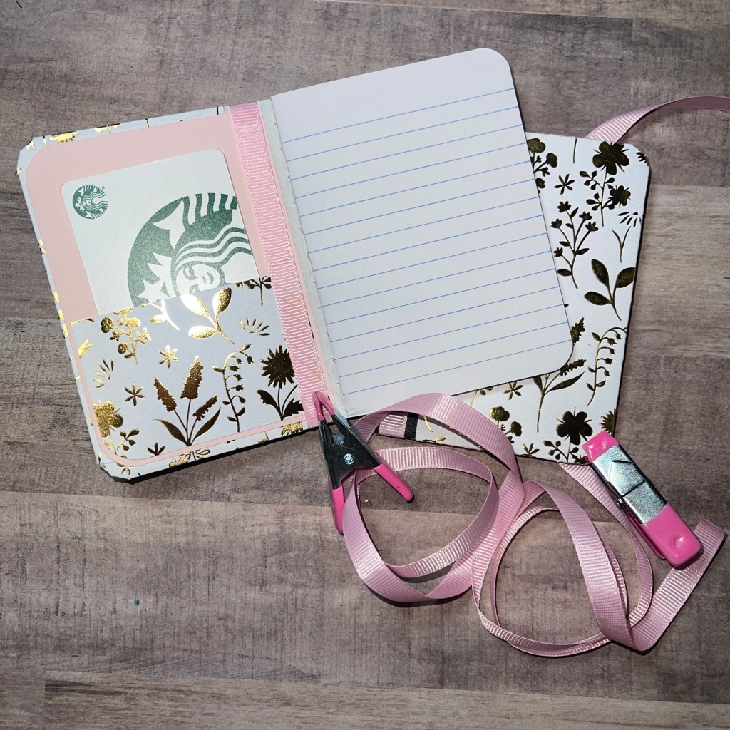 The mini composition books I used came in a pack of three from the Dollar Tree. I chose to use the “In Bloom” paper pad by Recollections. I cut the patterned paper at 3″ x 5″ for the front and back covers. I then rounded the corners (being careful of the directional paper). I used score tape to attach the patterned paper to the front and back covers, aligning the edge of the paper to the black spine binding. I then cut the overlapping paper at the corners. Once this was done, I folded the corners and edges in to the inside cover, attaching with liquid glue. I used some mini clips (also from the Dollar Tree) to hold the corners down while the glue dried. Once the outer covers were attached, I moved to the inside covers. I cut the inside covers from pink card stock at 4.25″ x 3″, rounding the corners as well. I then attached them to the inside cover, being careful not to get to close to the inside edge. Using the scrap piece of patterned paper (3″x2″) I rounded one corner and attached it to the front inside cover, creating a pocket for a gift card. I then added some ribbon just to give it the finishing touch. I think these will make cute party favors and am off to make another two dozen 🙂